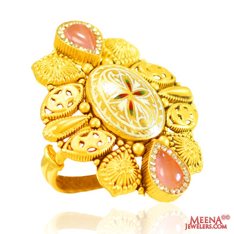 Elevate your jewelry collection with our exquisite 22Kt Pure Gold Antique Ring, a stunning blend of tradition and modernity. Featuring intricate Meenakari work at its center, this ring is adorned with two captivating pink tourmalines, elegantly surrounded by sparkling CZ stones. The meticulous filigree and laser-cut detailing enhance its artistic appeal, while the antique finish adds a timeless charm. Perfect for any occasion, this ring is not just an accessory; it's a statement piece that embodies elegance and sophistication.