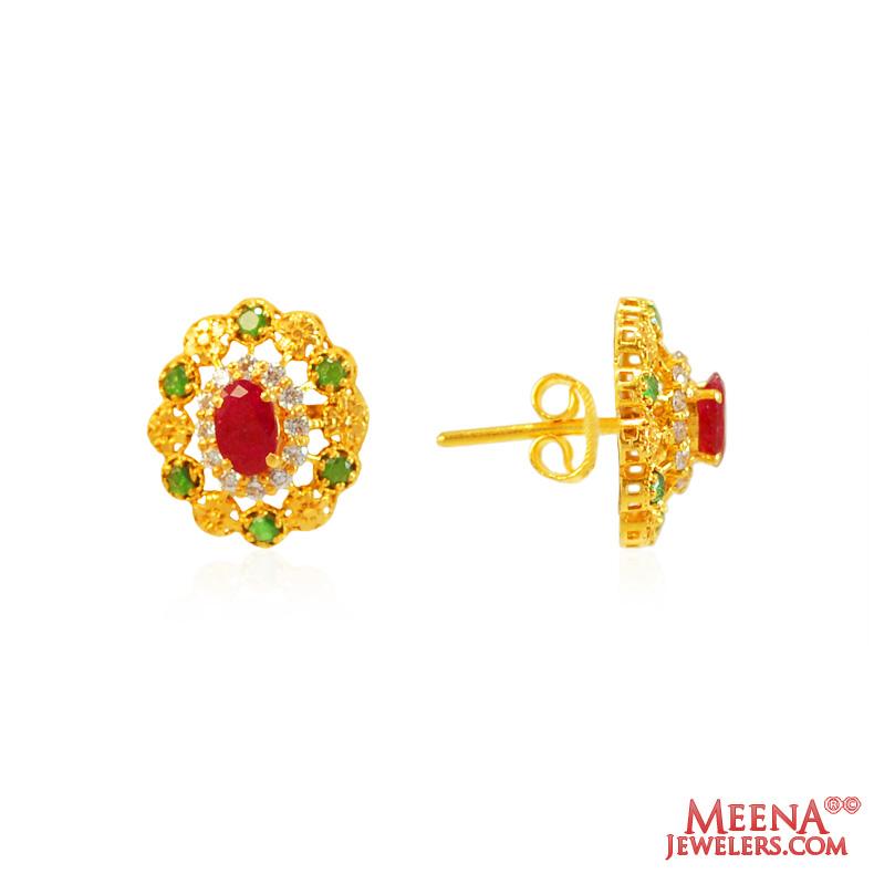 Elevate your style with these stunning 22Kt pure Gold Earrings, featuring a captivating Ruby-colored stone at the center, surrounded by a delicate halo of sparkling CZ stones. The intricate design is beautifully complemented by vibrant green Emerald stones on the sides, all set in a lightweight, oval shape that ensures comfort and ease of wear. Perfect for any occasion, these elegant earrings are a must-have addition to your jewelry collection!